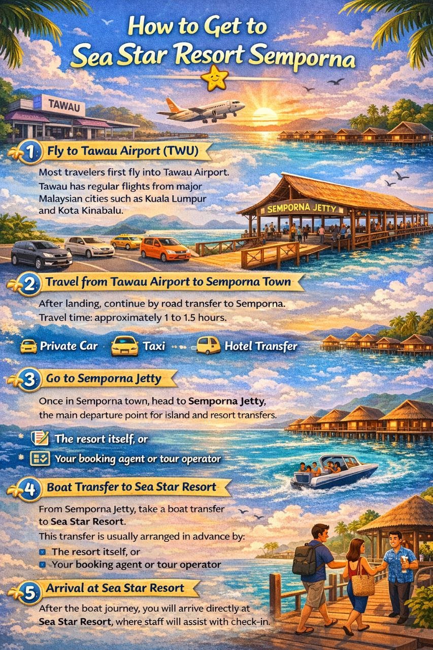 Travelers usually fly into Tawau Airport, which connects with major Malaysian cities. From the airport, it takes approximately 1 to 1.5 hours by road to reach Semporna town. From Semporna Jetty, guests transfer to Sea Star Resort by boat. The resort or booking agent typically arranges this transfer in advance.